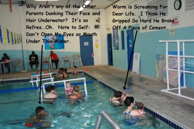 A couple of times during the swim class, the instructor tried to pry Worm away from me in hopes that he would forget his fears and paddle about in reckless abandon. Not a chance. His screaming only increased a few decibels and in defeat, the instructor handed him back to me.