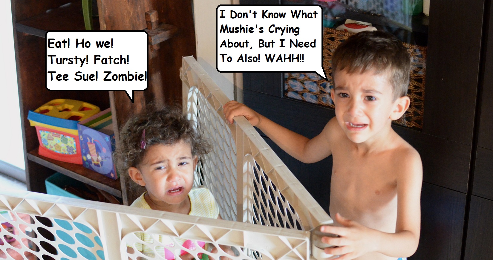 - Mushie screamed “Ho we! Ho we!” which means the same as “Hey, lanky asshat! I’m not interested in walking around anymore. Hold me now!” So now I was carrying both kids and the diaper bag. (In case you were wondering, the kiddie wagon was parked at the other side of the zoo, where we got on the Skycar. It was too big to fit inside.)
